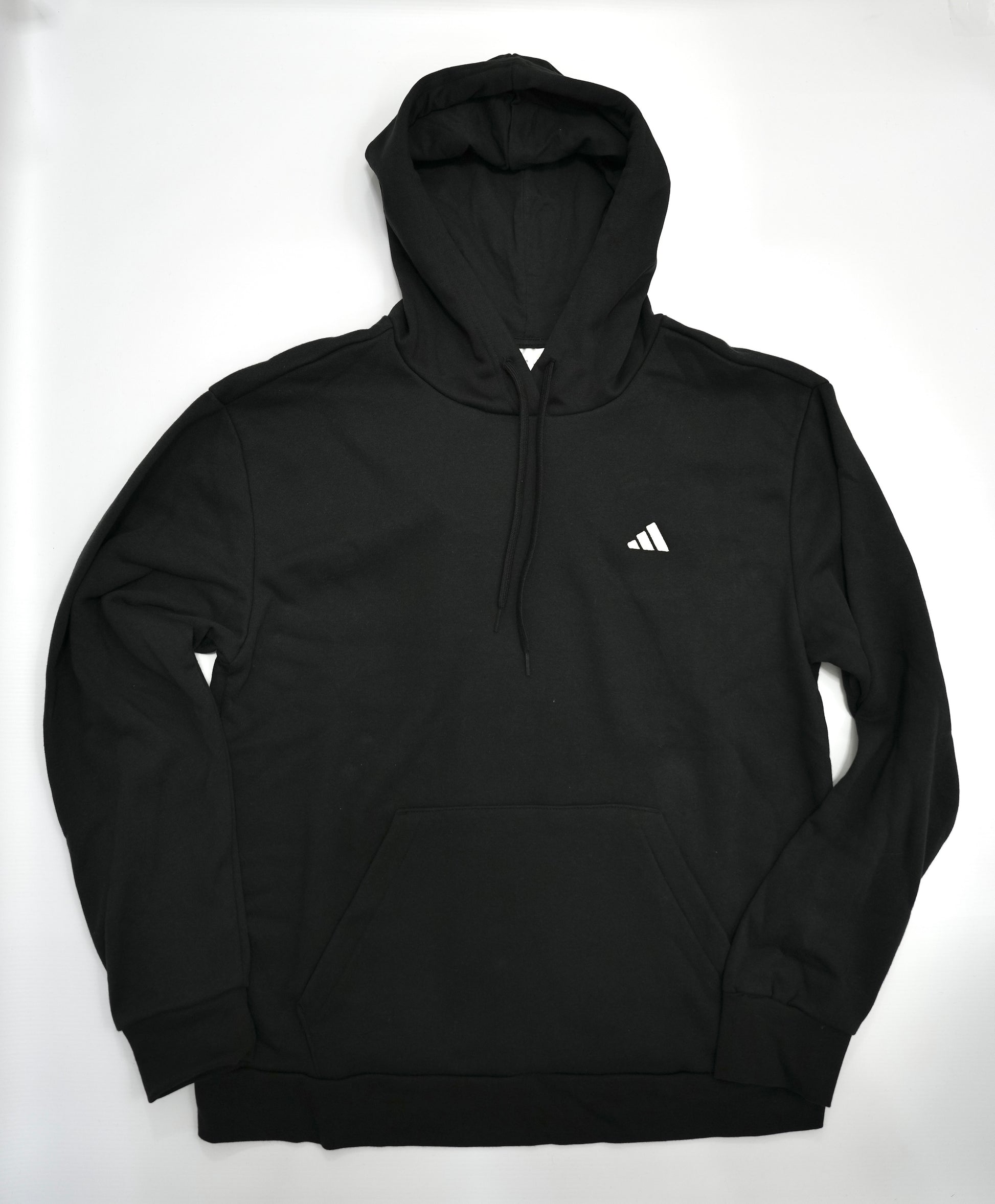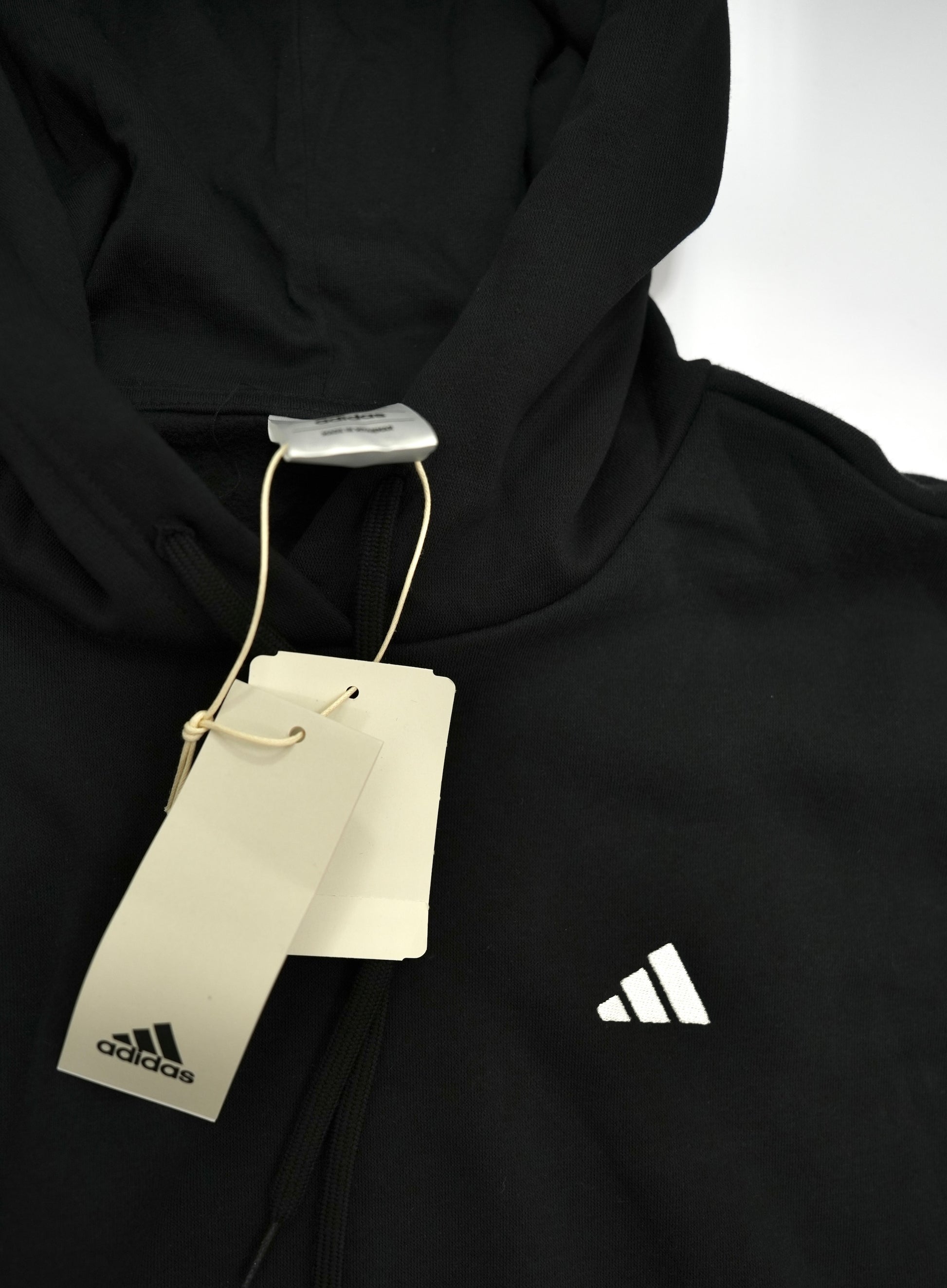 Buzo canguro negro con pequeño logo en la parte izquierda del pecho y capucha con cordon ajustable. Tiene 55cm de ancho y 65cm de largo