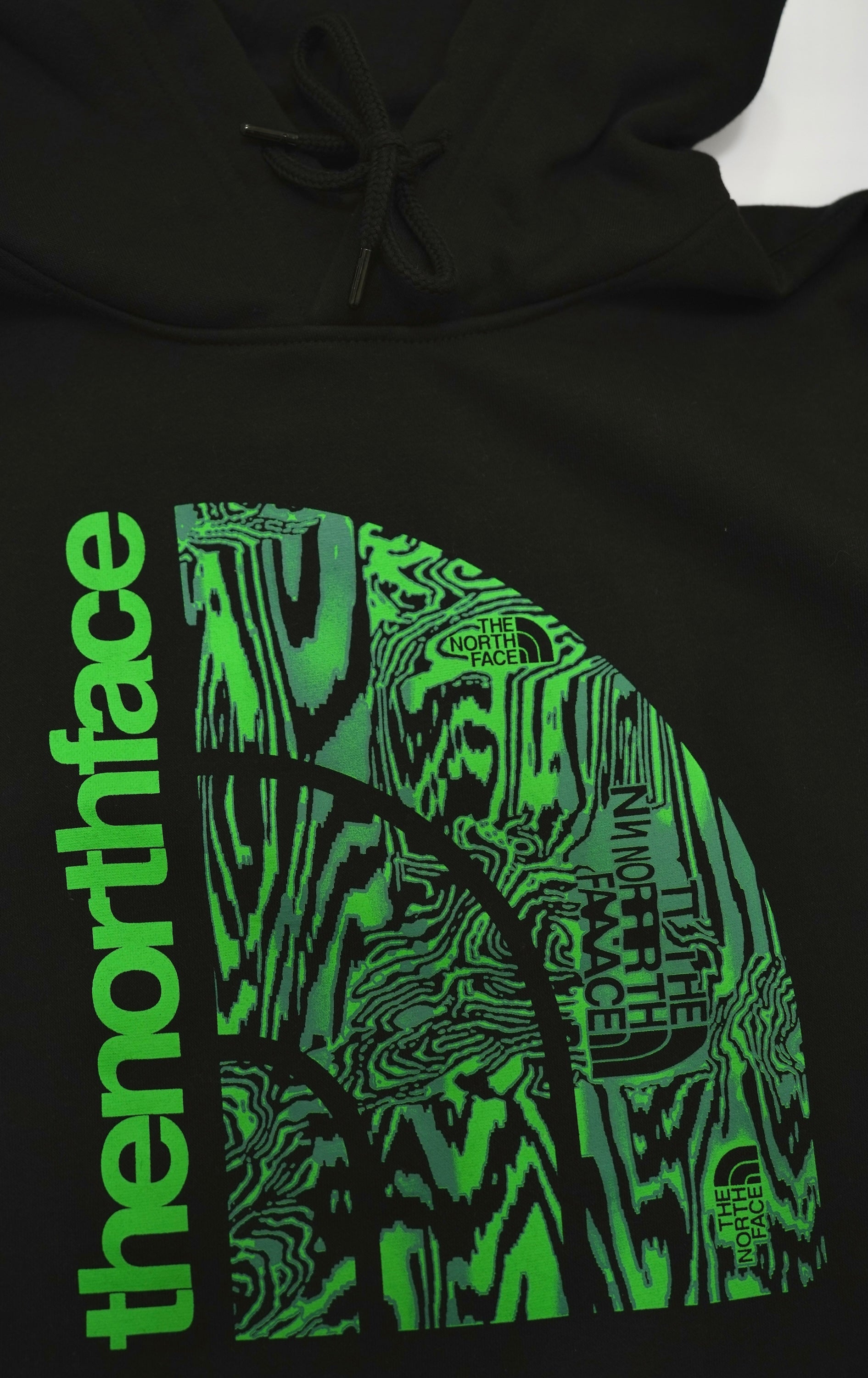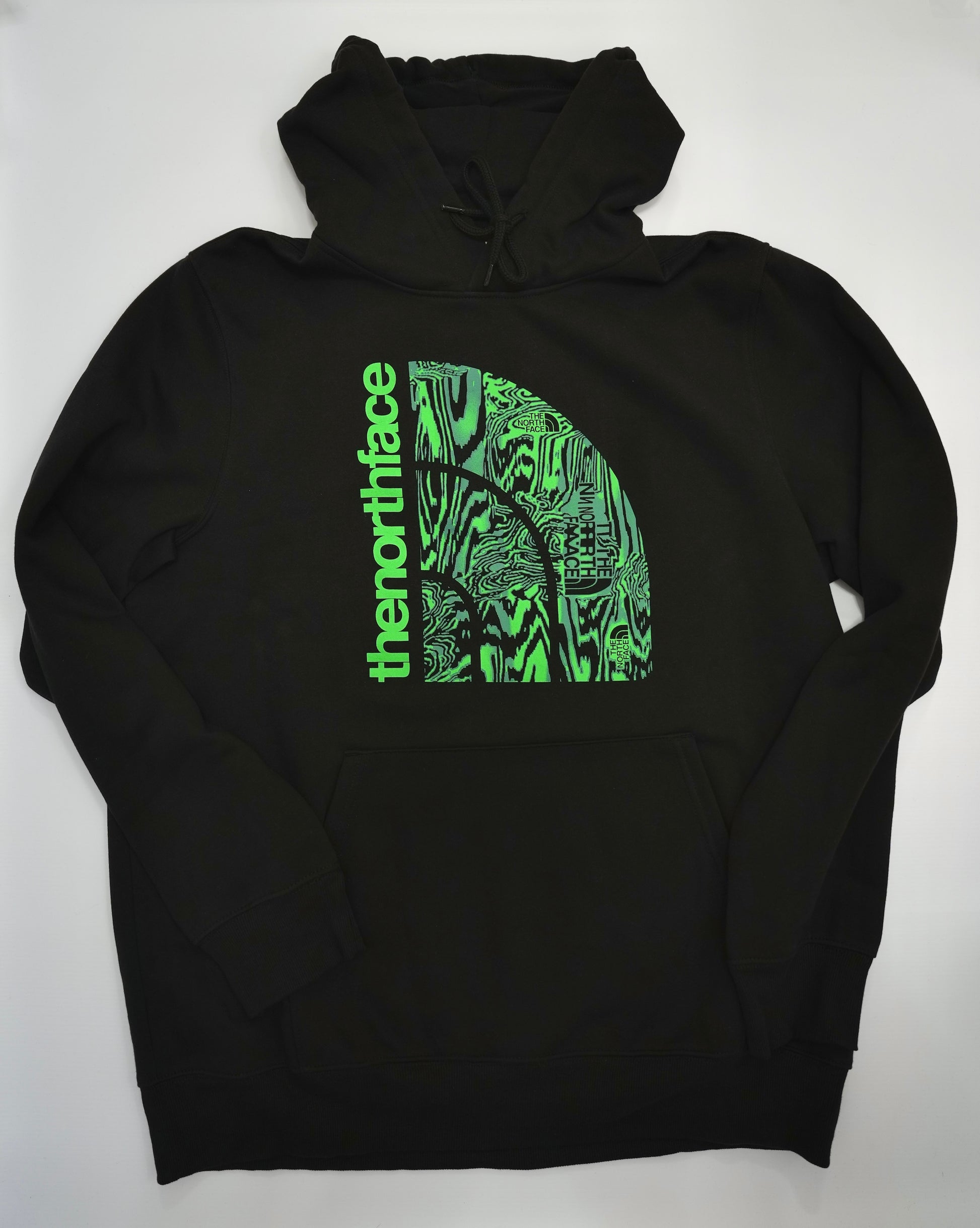 Buzo canguro negro con logo The North Face en verde y capucha con 62cm de ancho y 75cm de largo.