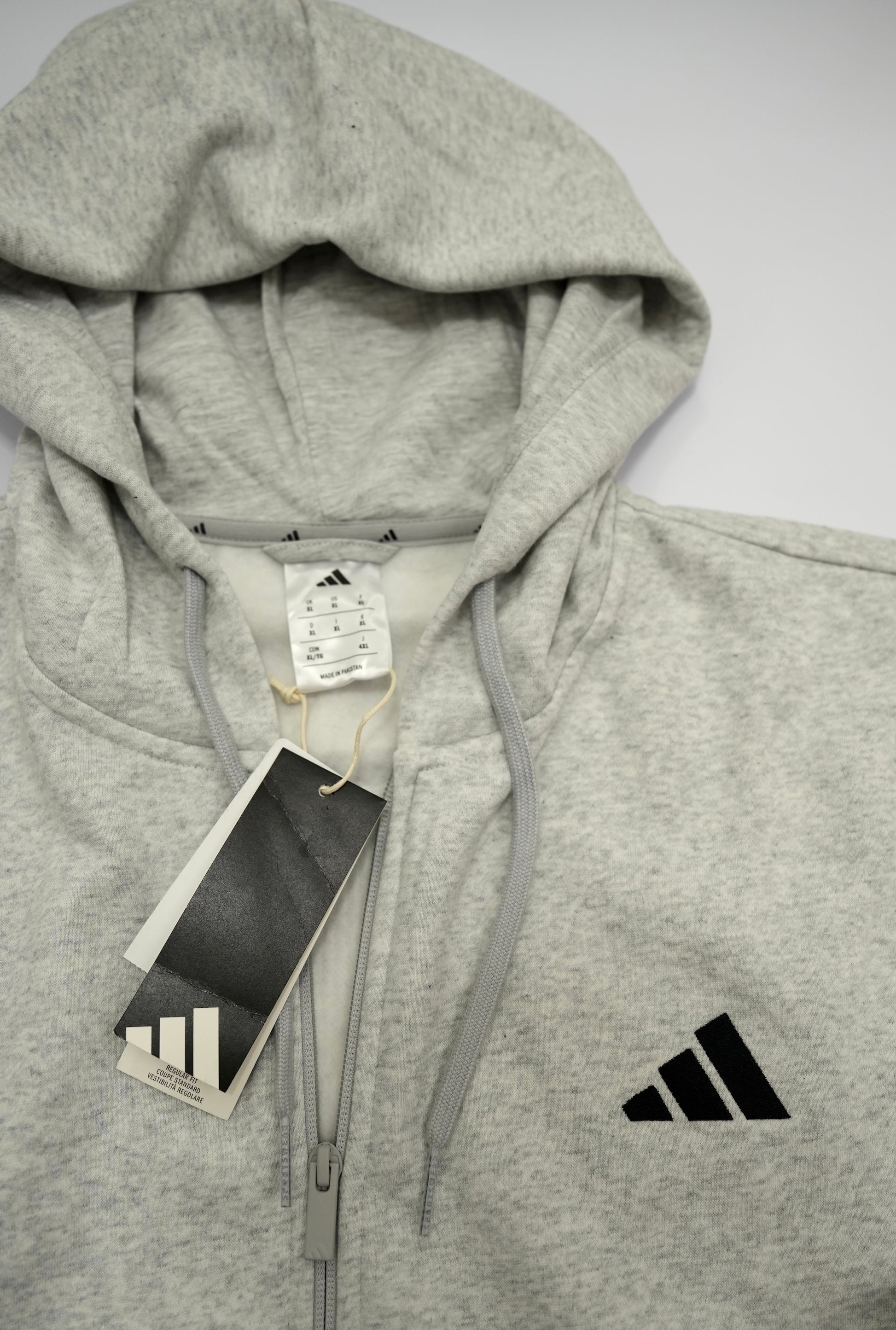 Campera gris basica con bolsillos y capucha con cordon ajustable. Tiene las tres tiras en las mangas y logo de adidas en la parte izquierda del pecho.