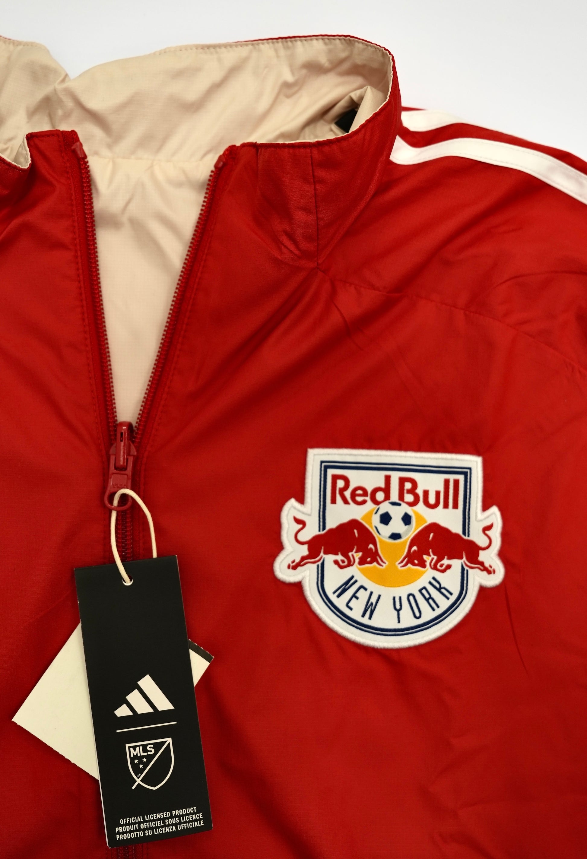 Campera reversible "RedBull". De un lado roja con las tres tiras en las mangas y el logo de "RedBull" en la parte izquierda del pecho y del otro es color beige y en la parte izquierda del pecho tiene logo "NY". Tiene 67cm de ancho y 80cm de largo.