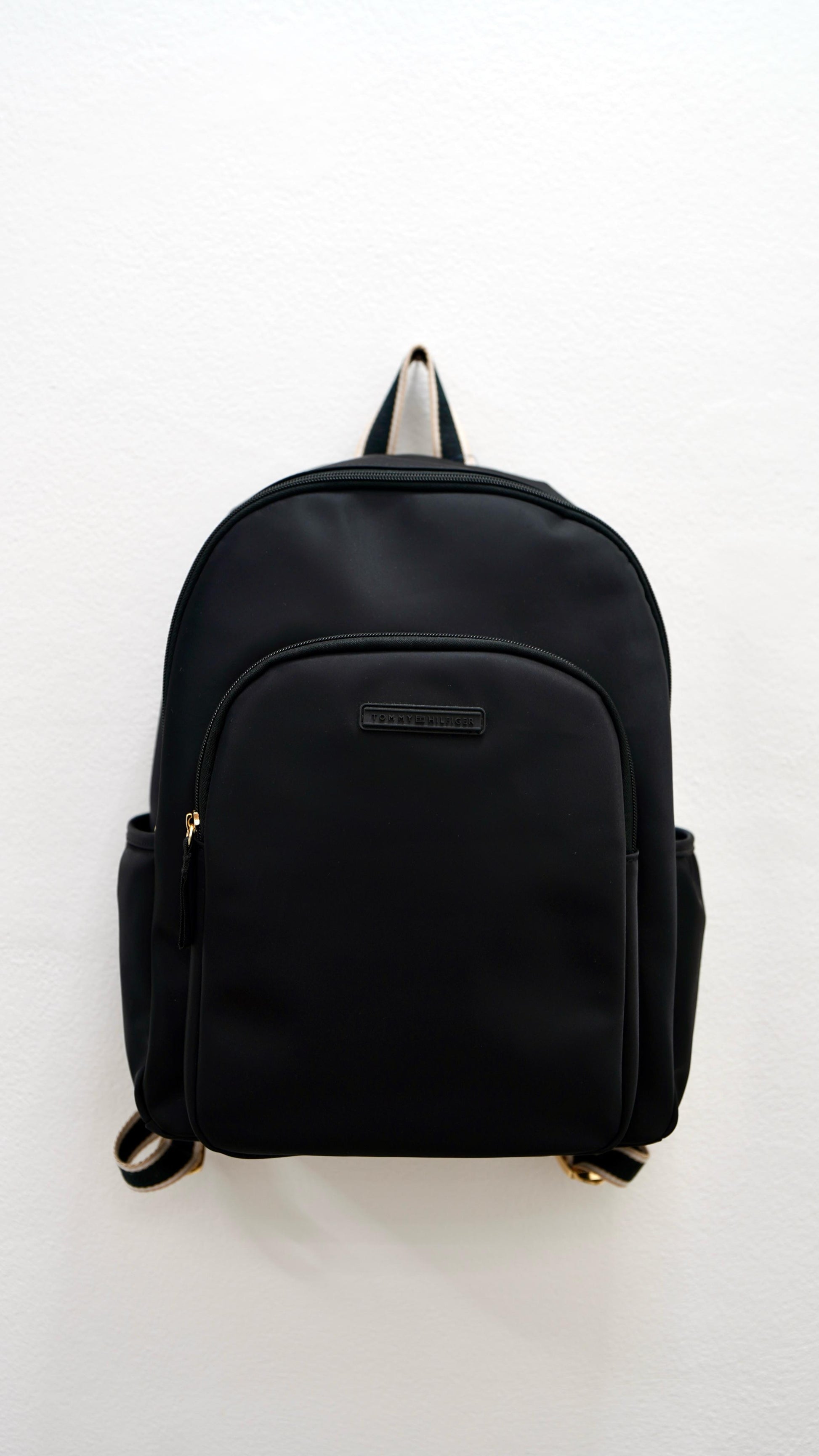 Mochila negra con 2 compartimentos, uno con un bolsillo con cierre. Bolsillos laterales y correas ajustables. Mide 40cm de alto y 30cm de largo en la base.
