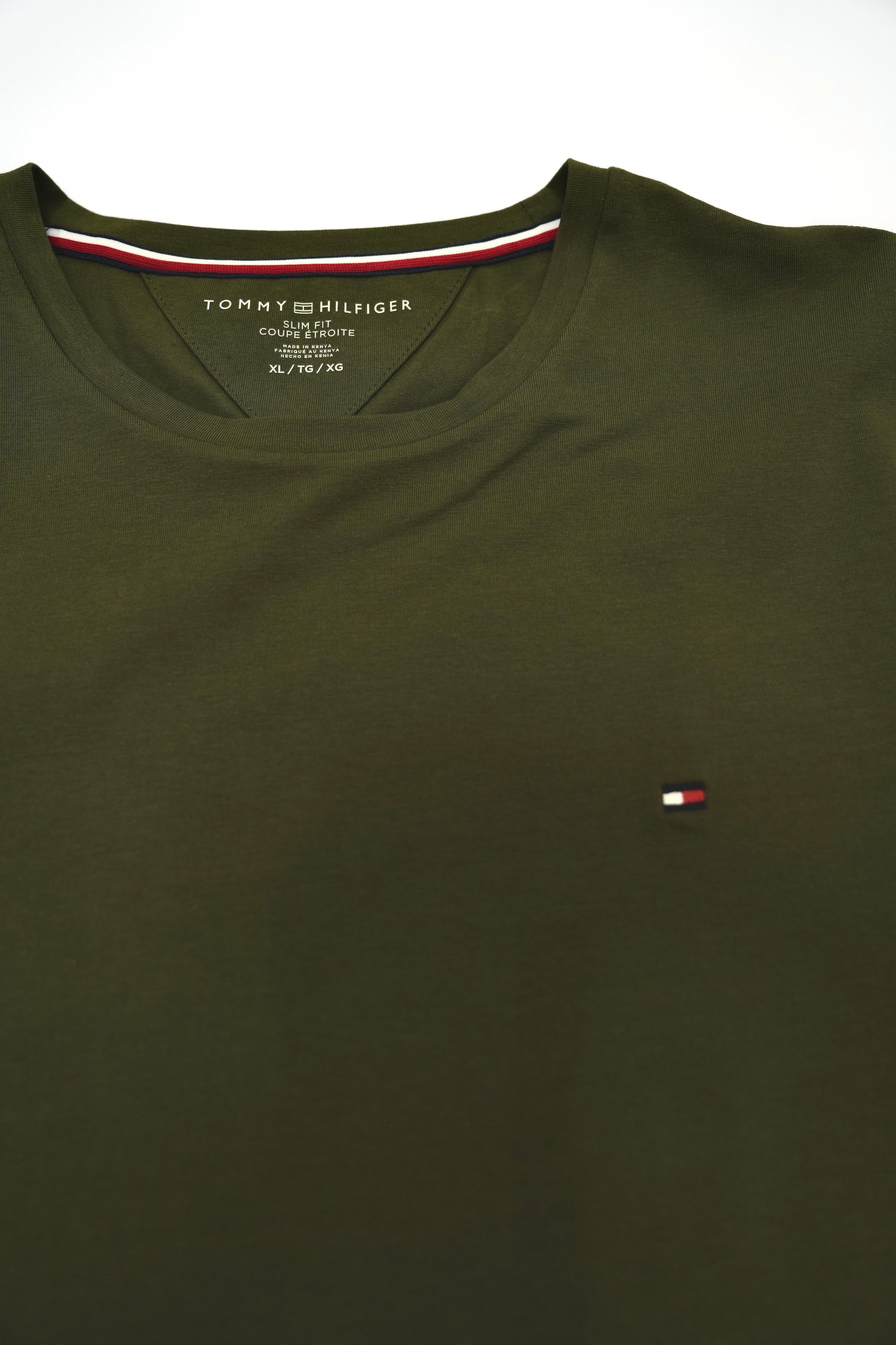 Remera basica slim fit verde musgo de cuello redondo con 57cm de ancho y 75cm de largo.
