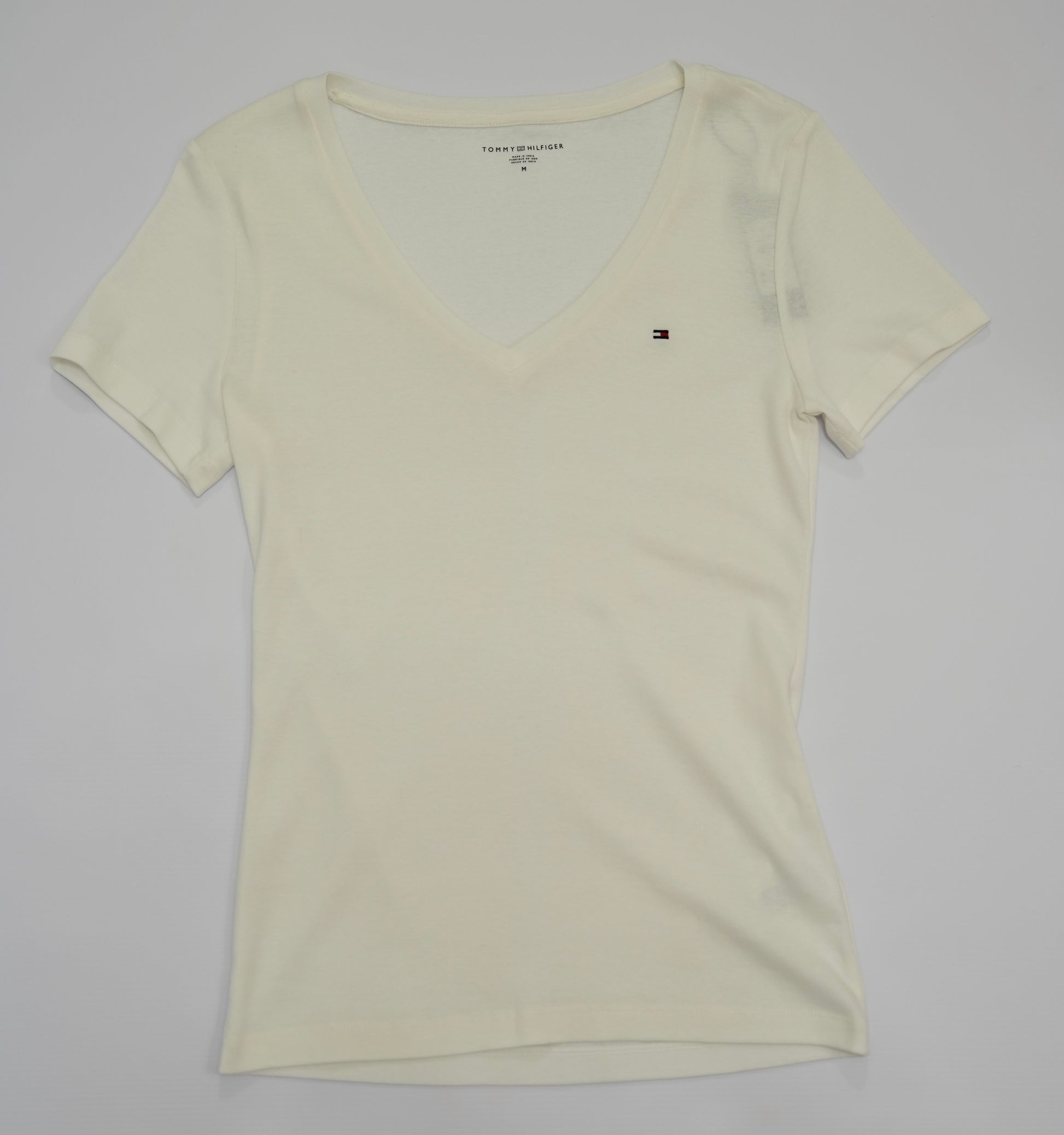 Remera basica blanca con escote en v de 44cm de ancho y 67 cm de largo.